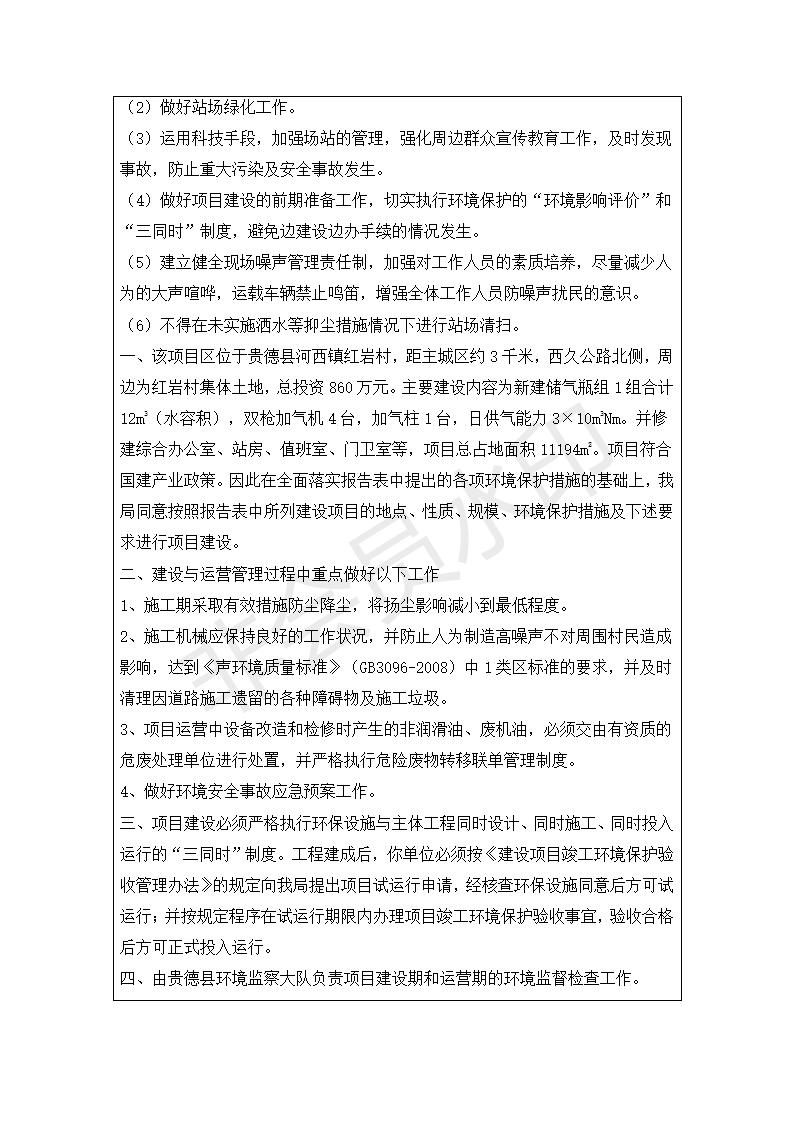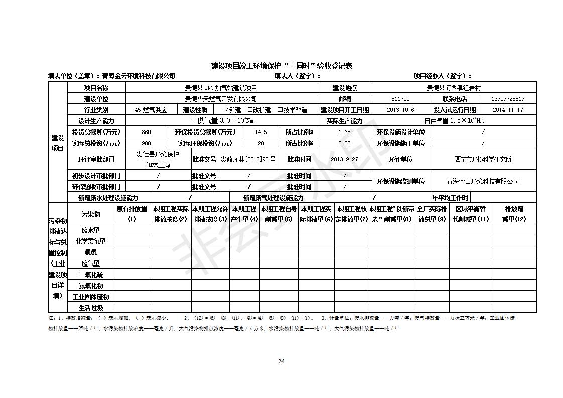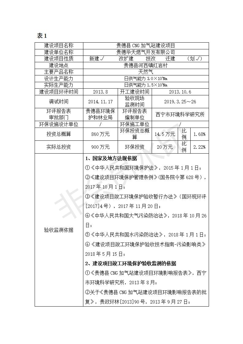 根據(jù)中華人民共和國(guó)務(wù)院令第682號(hào)《國(guó)務(wù)院關(guān)于修改〈建設(shè)項(xiàng)目環(huán)境保護(hù)管理?xiàng)l例〉的決定》和《建設(shè)項(xiàng)目竣工環(huán)境保護(hù)驗(yàn)收暫行辦法》(國(guó)務(wù)院令682號(hào)),青藏高原特色生物資源綠色開發(fā)工程研究中心建設(shè)項(xiàng)目竣工環(huán)境保護(hù)驗(yàn)收內(nèi)容(包括竣工環(huán)境保護(hù)驗(yàn)收調(diào)查報(bào)告和驗(yàn)收意見)公示如下: 一、項(xiàng)目名稱:貴德縣CNG加氣站建設(shè)項(xiàng)目 二、地點(diǎn):貴德縣河西鎮(zhèn)紅巖村 三、建設(shè)單位:貴德華天燃?xì)忾_發(fā)有限公司 四、建設(shè)內(nèi)容:日供氣量為1.5×104Nm的加氣站 五、公示時(shí)間:二〇一九年五月二十九日至二〇一九年六月二十五日 六、聯(lián)系人:張工 公示期間,對(duì)上述公示內(nèi)容如有異議,請(qǐng)以書面形式反饋,個(gè)人須署真實(shí)姓名,單位須加蓋公章。