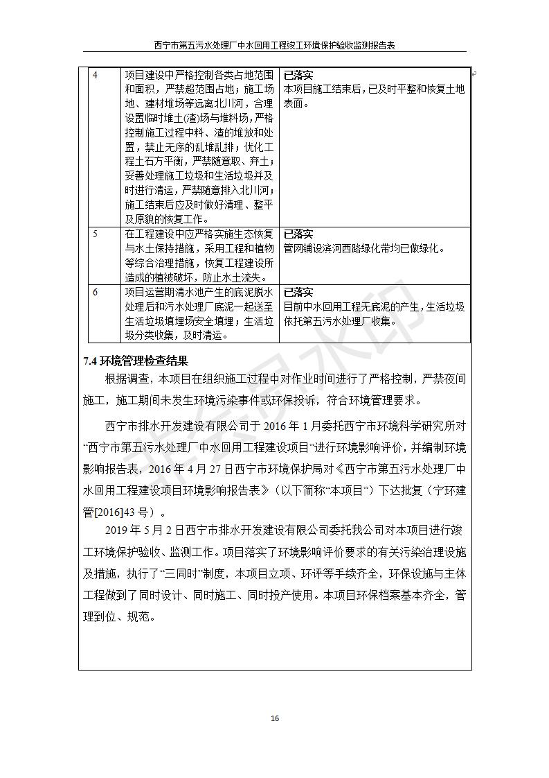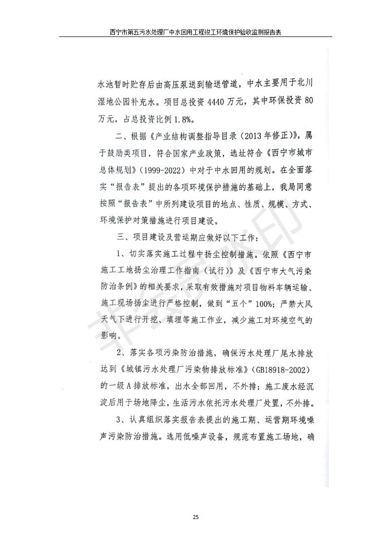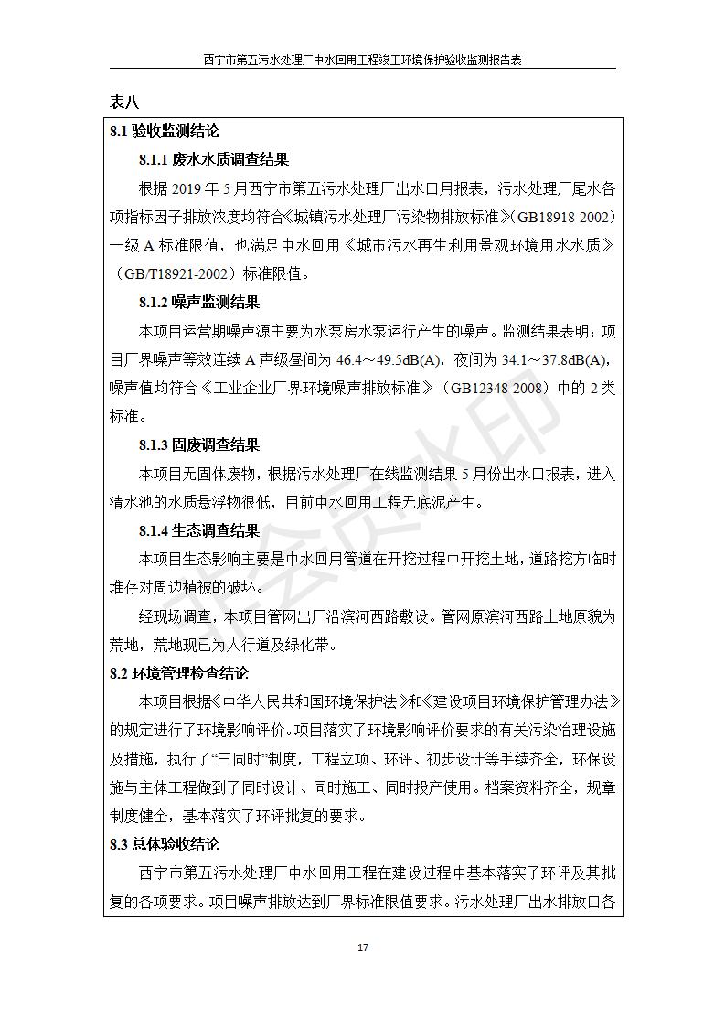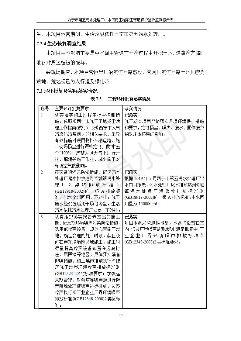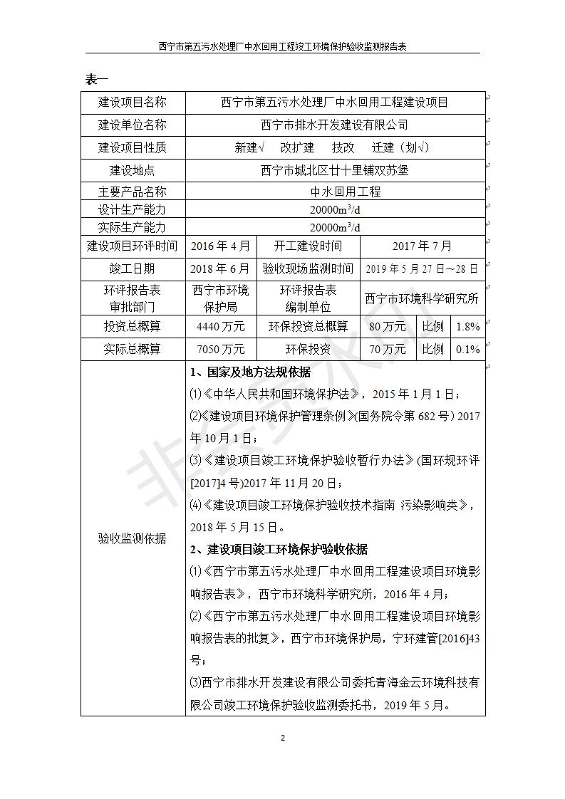 根據(jù)中華人民共和國國務(wù)院令第682號《國務(wù)院關(guān)于修改〈建設(shè)項目環(huán)境保護管理條例〉的決定》和《建設(shè)項目竣工環(huán)境保護驗收暫行辦法》(國務(wù)院令682號),西寧市第五污水處理廠中水回用工程建設(shè)項目(包括竣工環(huán)境保護驗收監(jiān)測報告表和驗收意見)公示如下。 一、項目名稱:西寧市第五污水處理廠中水回用工程建設(shè)項目 二、地點:西寧市城北區(qū)廿十里鋪雙蘇堡 三、建設(shè)單位:西寧市排水開發(fā)建設(shè)有限公司