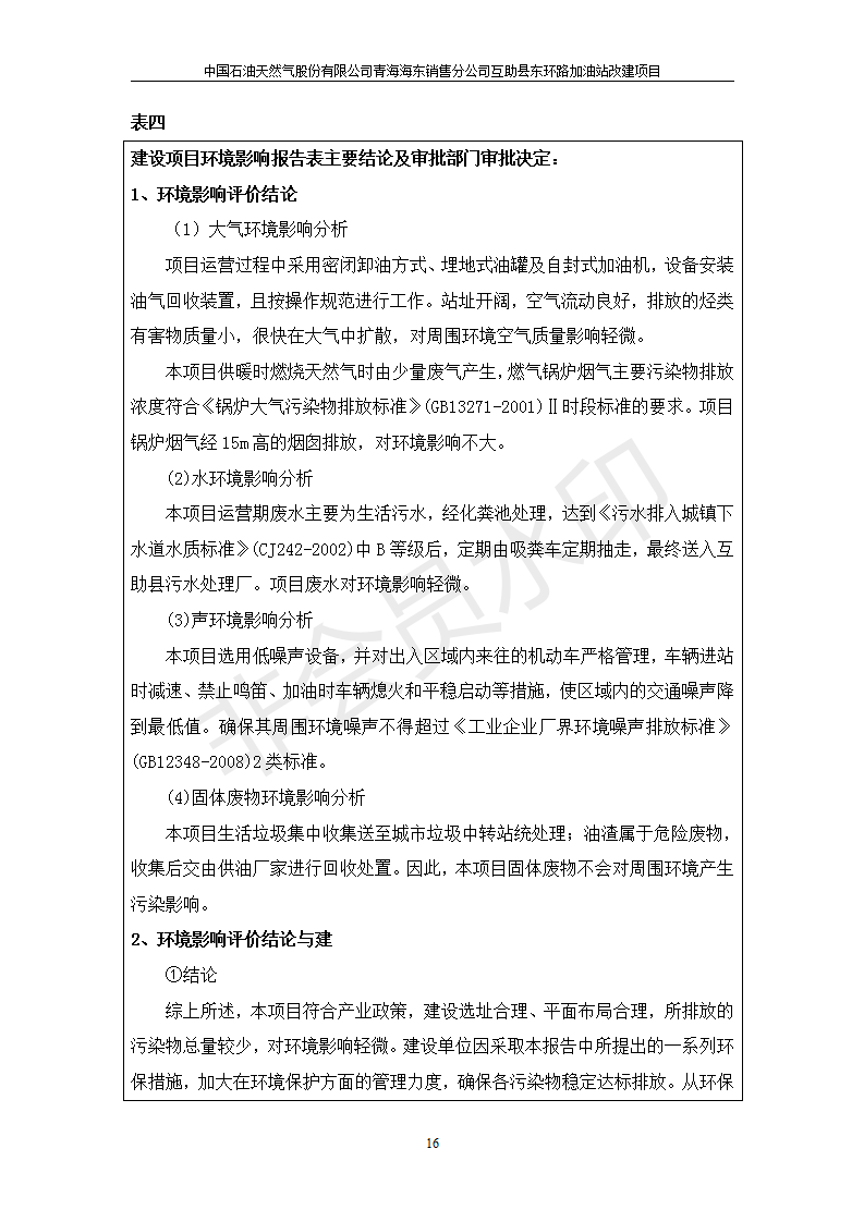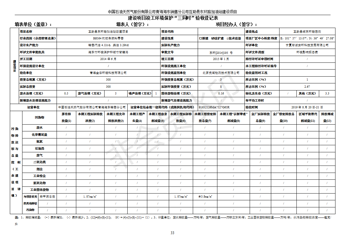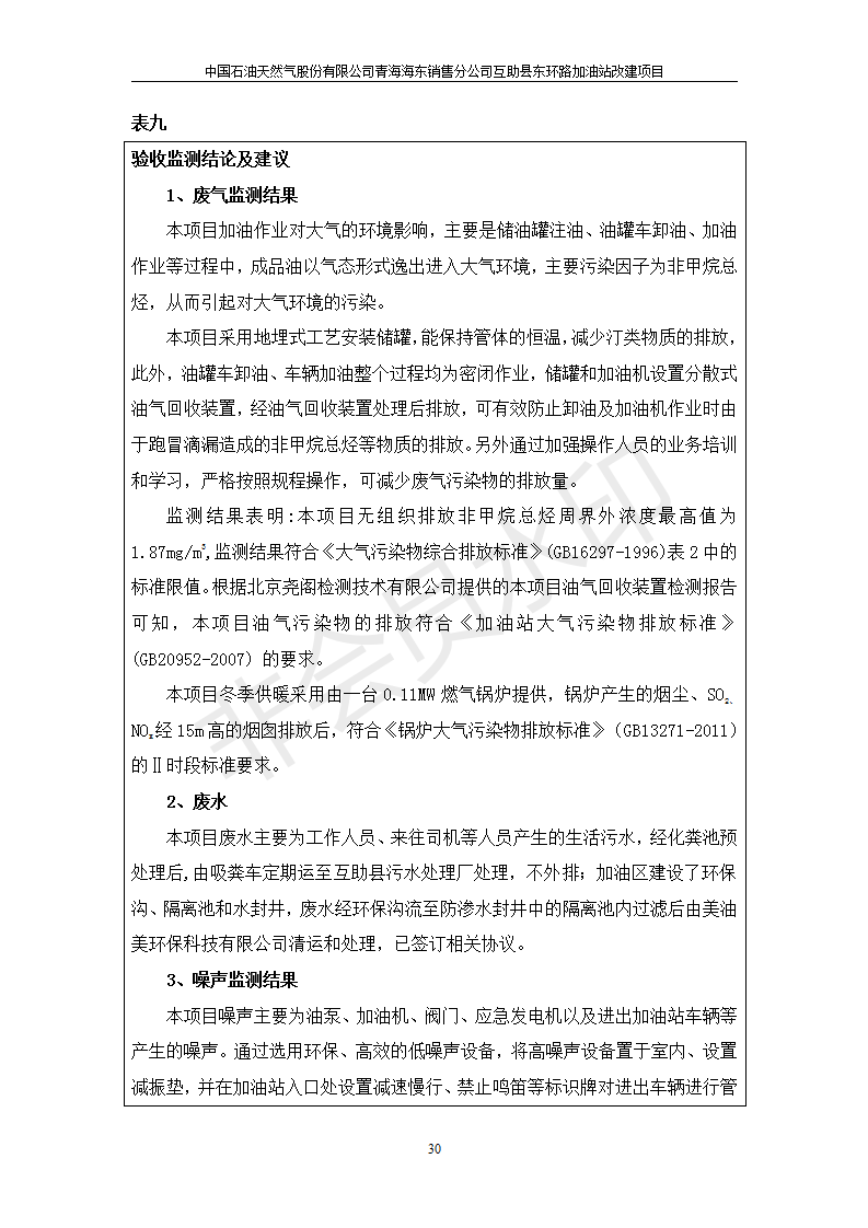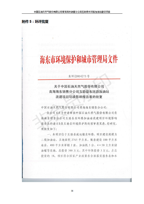 根據(jù)中華人民共和國國務院令第682號《國務院關于修改〈建設項目環(huán)境保護管理條例〉的決定》和《建設項目竣工環(huán)境保護驗收暫行辦法》(國務院令682號),互助縣東環(huán)路加油站改建項目(包括竣工環(huán)境保護驗收監(jiān)測報告表和驗收意見)公示如下。 一、項目名稱:互助縣東環(huán)路加油站改建項目 二、地點:青海省海東市互助縣東環(huán)路 六、聯(lián)系電話:0971-6515411 七、公示時間:二〇一九年九月二十七日至二〇一九年十月二十九日 公示期間,對上述公示內(nèi)容如有異議,請以書面形式反饋,個人須署真實姓名,單位須加蓋公章。