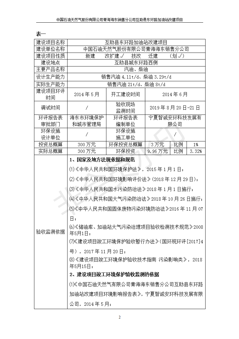 互助縣東環(huán)路加油站改建項目竣工環(huán)境保護驗收監(jiān)測報告表公示發(fā)布日期:(2019-9-27) 點擊次數(shù):2495 |