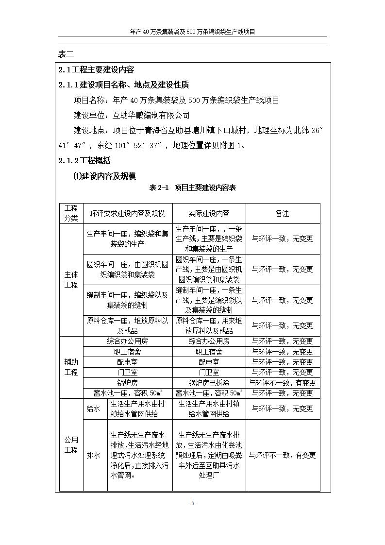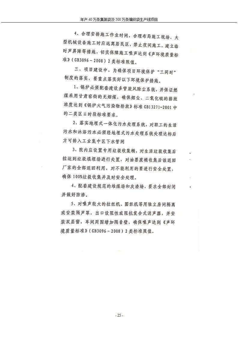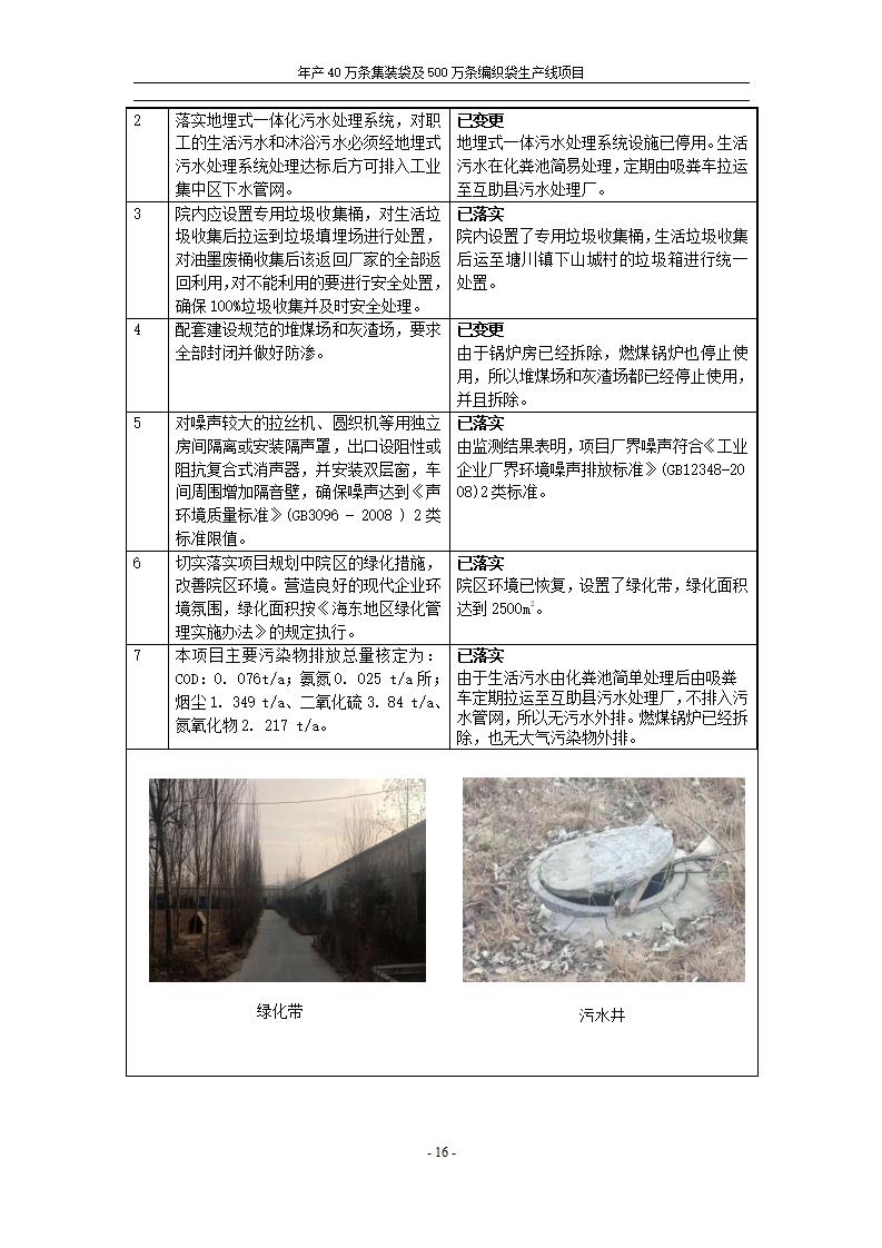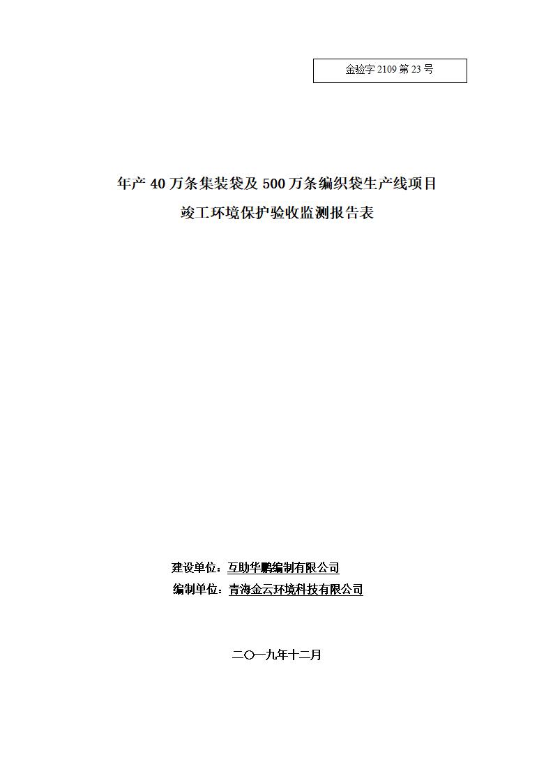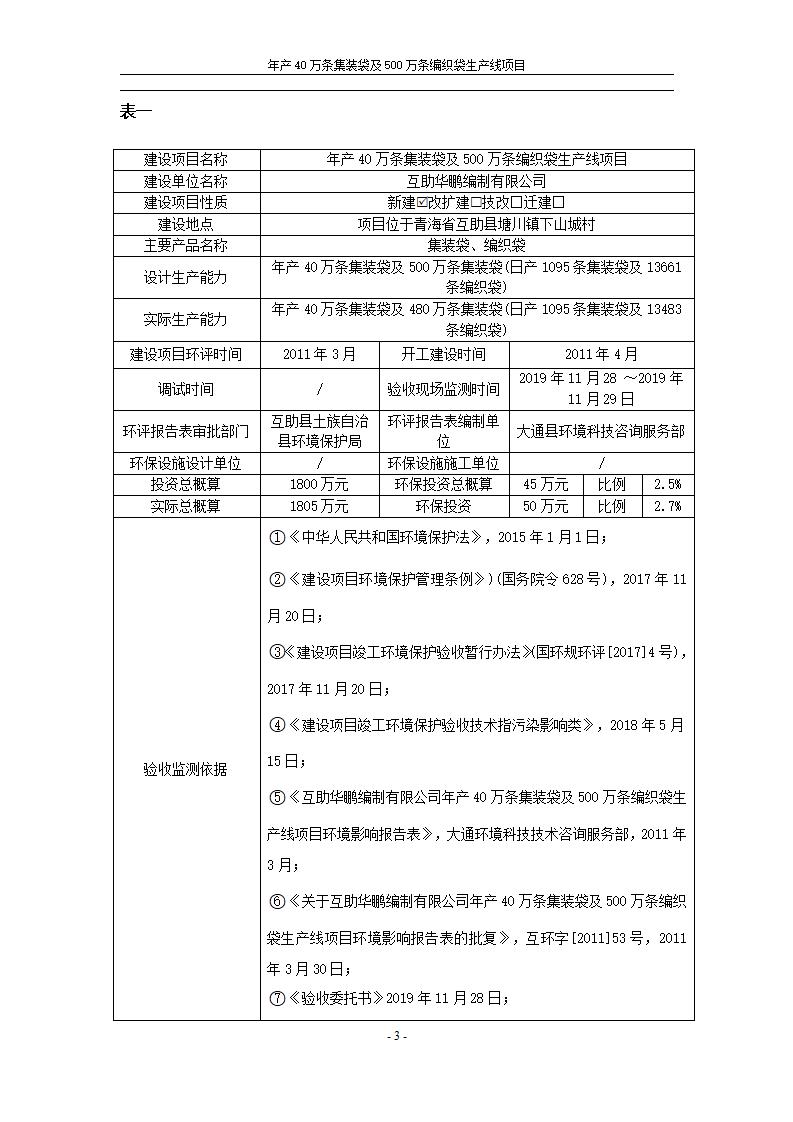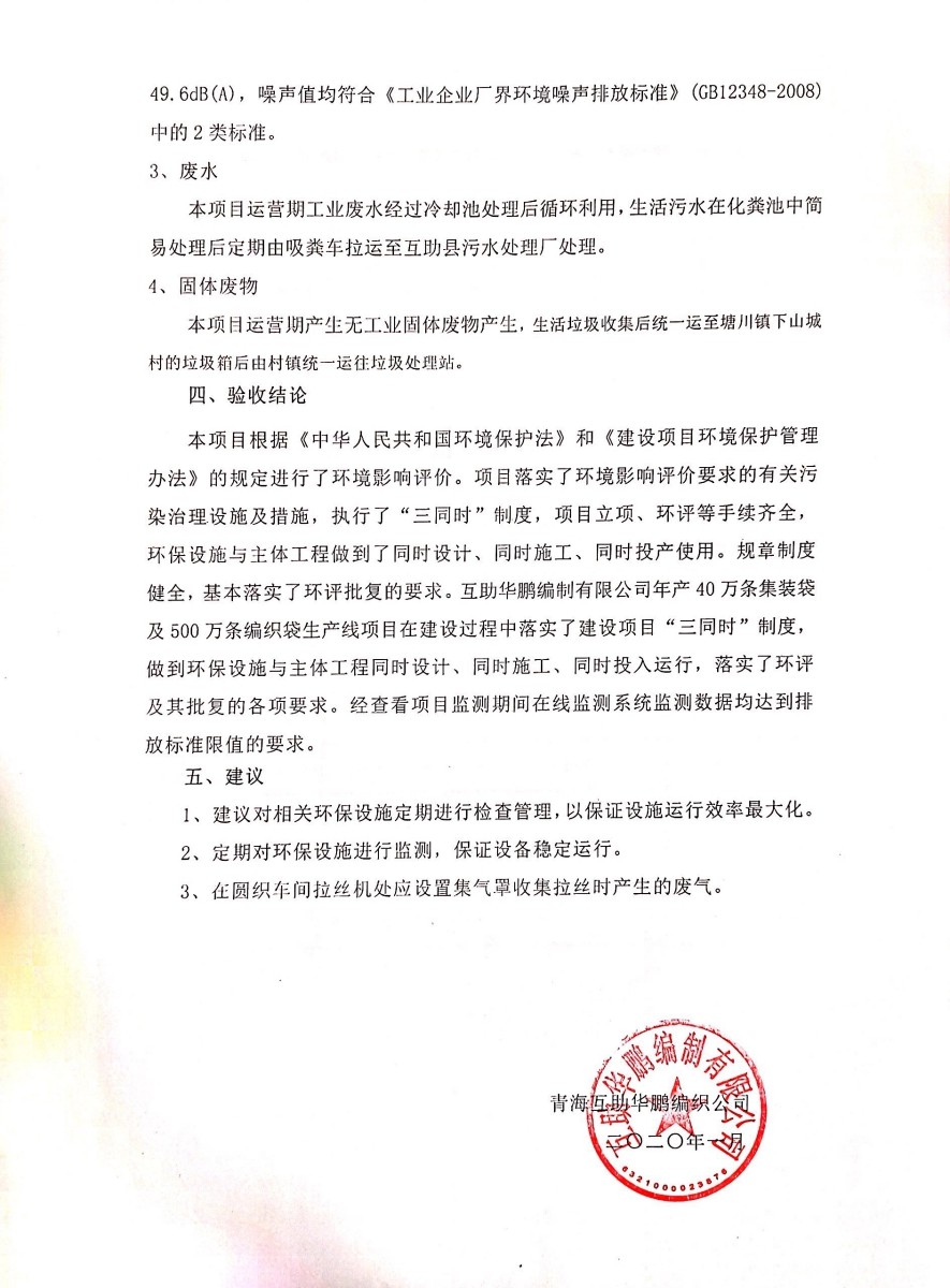 根據(jù)中華人民共和國國務(wù)院令第682號《國務(wù)院關(guān)于修改〈建設(shè)項(xiàng)目環(huán)境保護(hù)管理?xiàng)l例〉的決定》和《建設(shè)項(xiàng)目竣工環(huán)境保護(hù)驗(yàn)收暫行辦法》(國務(wù)院令682號),年產(chǎn)40萬條集裝袋及500萬條編織袋生產(chǎn)線項(xiàng)目(包括竣工環(huán)境保護(hù)驗(yàn)收調(diào)查表和驗(yàn)收意見)公示如下。 一、項(xiàng)目名稱: 年產(chǎn)40萬條集裝袋及500萬條編織袋生產(chǎn)線項(xiàng)目 二、地點(diǎn):互助縣塘川鎮(zhèn)下山城村 五、聯(lián)系人:張工 六、聯(lián)系電話:0971-6515411 七、公示時(shí)間:二〇二〇年一月十三日至二〇二〇年二月十二日 公示期間,對上述公示內(nèi)容如有異議,請以書面形式反饋,個(gè)人須署真實(shí)姓名,單位須加蓋公章。
