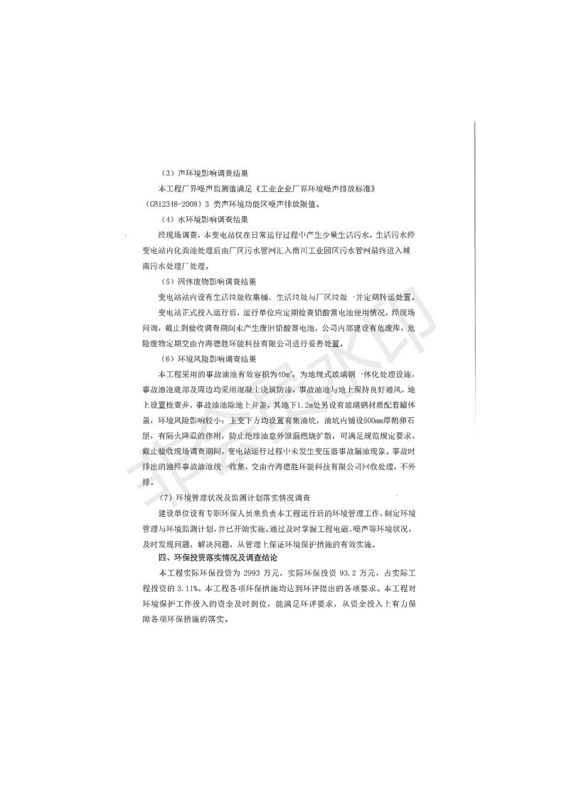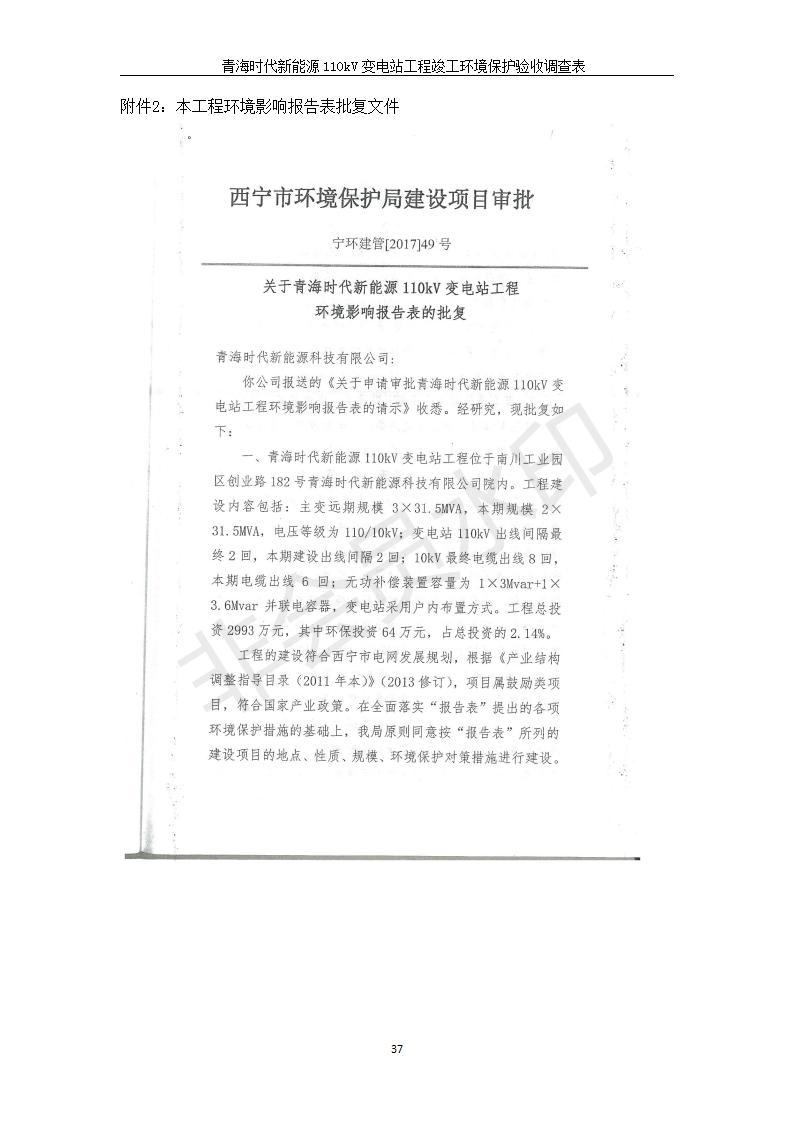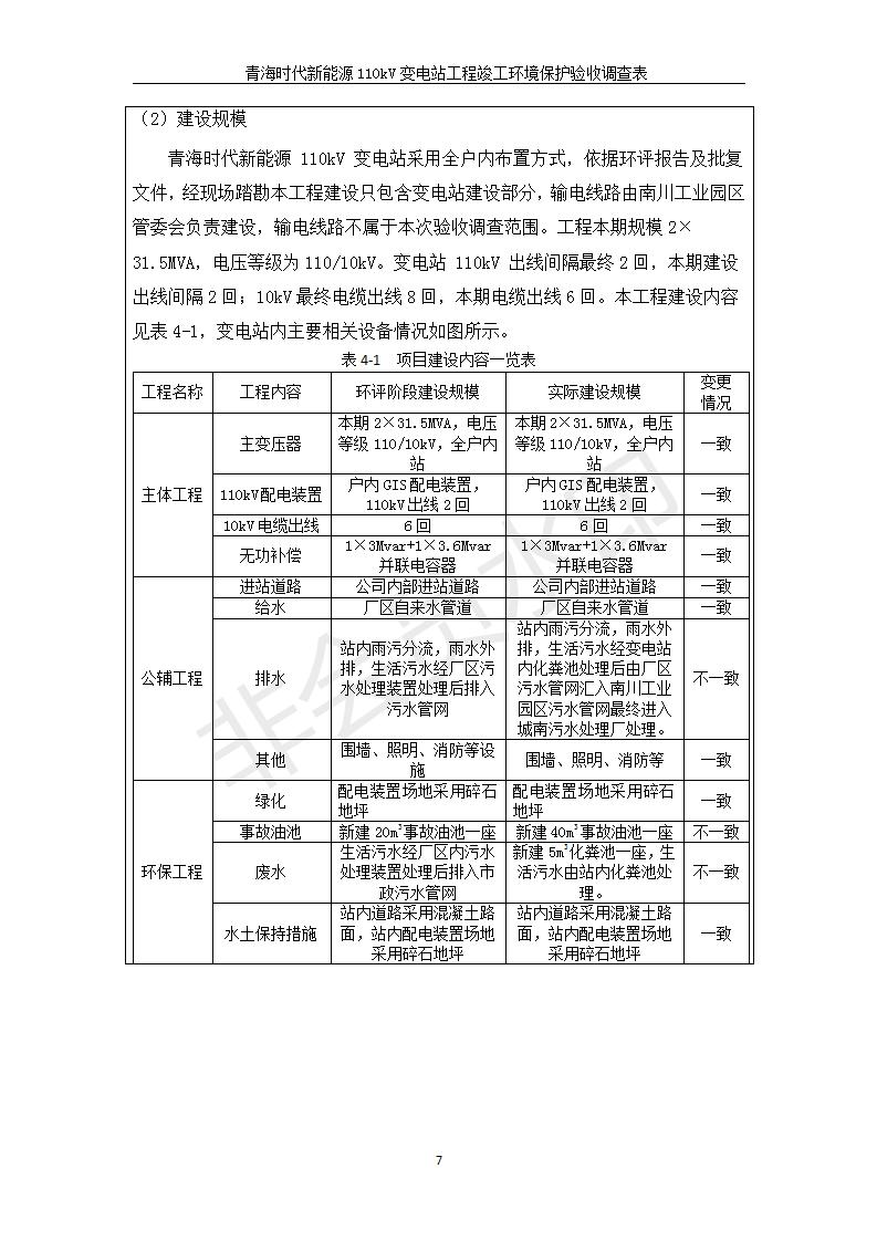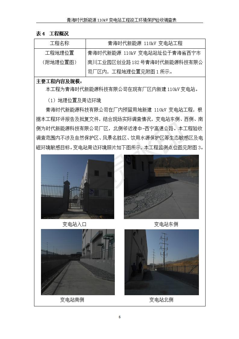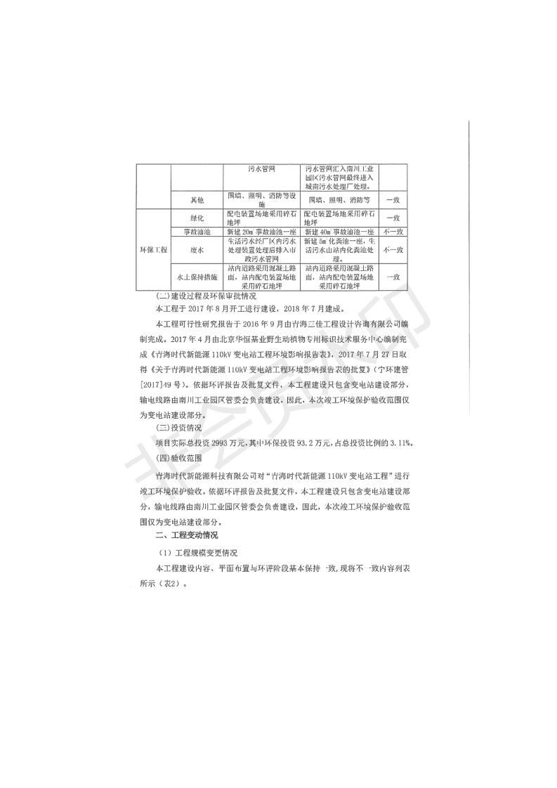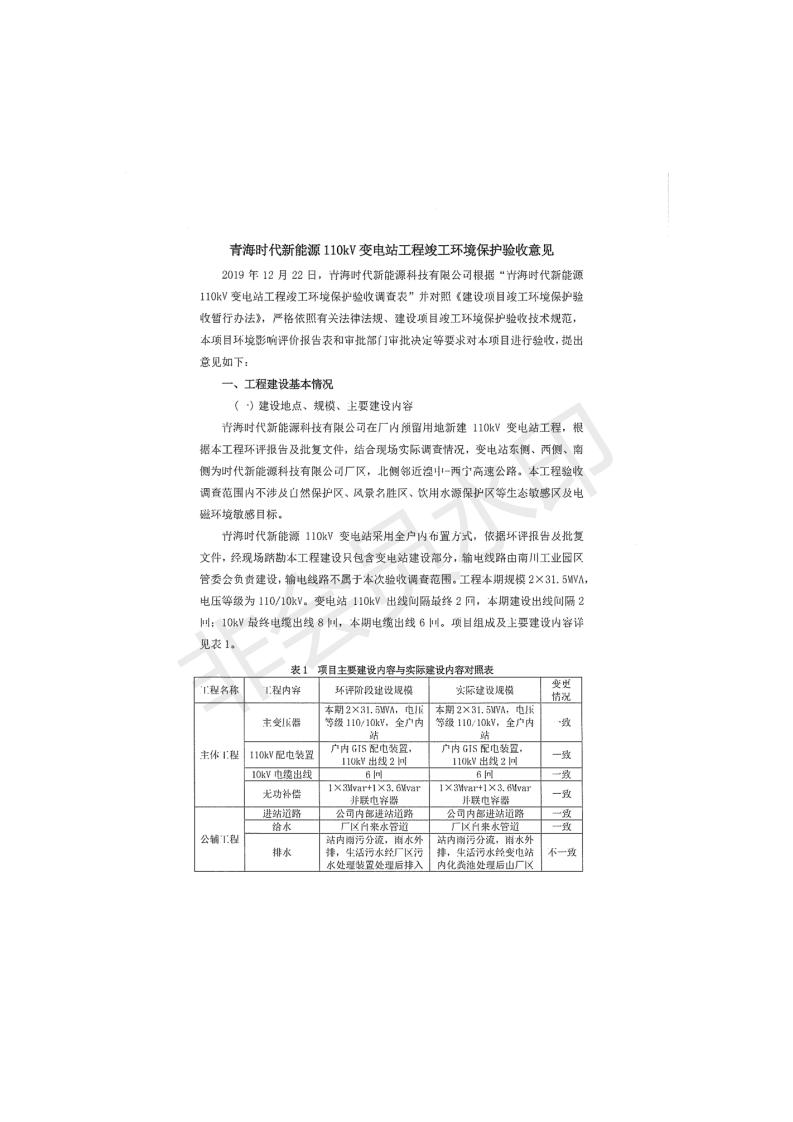 根據(jù)中華人民共和國國務院令第682號《國務院關(guān)于修改〈建設項目環(huán)境保護管理條例〉的決定》和《建設項目竣工環(huán)境保護驗收暫行辦法》(國務院令682號),青海時代新能源110kV變電站工程(包括竣工環(huán)境保護驗收調(diào)查表和驗收意見)公示如下。 一、項目名稱:青海時代新能源110kV變電站工程 二、地點:青海省西寧市南川工業(yè)園區(qū)創(chuàng)業(yè)路182號青海時代新能源科技有限公司廠區(qū)內(nèi) 三、建設單位:青海時代新能源科技有限公司 四、建設內(nèi)容:青海時代新能源 110kV 變電站采用全戶內(nèi)布置方式,依據(jù)環(huán)評報告及批復文件,經(jīng)現(xiàn)場踏勘本工程建設只包含變電站建設部分,輸電線路由南川工業(yè)園區(qū)管委會負責建設,輸電線路不屬于本次驗收調(diào)查范圍。工程本期規(guī)模2×31.5MVA,電壓等級為110/10kV。變電站 110kV 出線間隔最終2回,本期建設出線間隔2回;10kV最終電纜出線8回,本期電纜出線6回。 五、聯(lián)系人:張工 六、聯(lián)系電話:0971-6515411 七、公示時間:二〇二〇年一月十四日至二〇二〇年二月十三日 公示期間,對上述公示內(nèi)容如有異議,請以書面形式反饋,個人須署真實姓名,單位須加蓋公章。